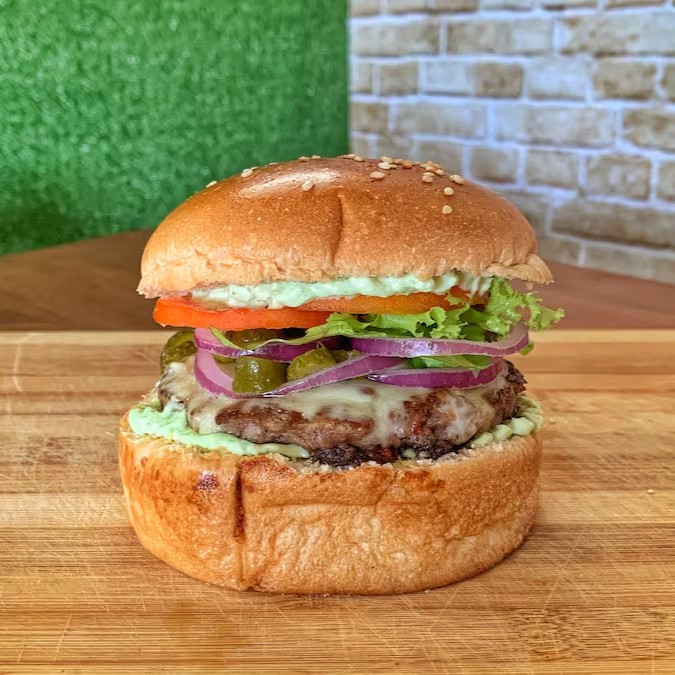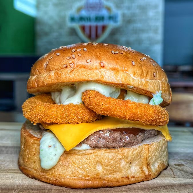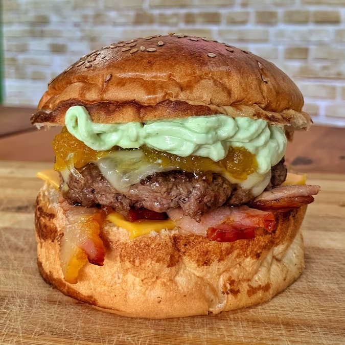 Saboroso e suculento hambúrguer artesanal recheado com cheddar, muçarela, berbecue, bacon crocante, picles refrescantes, anéis de cebola crocantes, regado com deliciosa geléia de pimenta artesanal e maionese especial. Uma explosão de sabores em cada mordida!