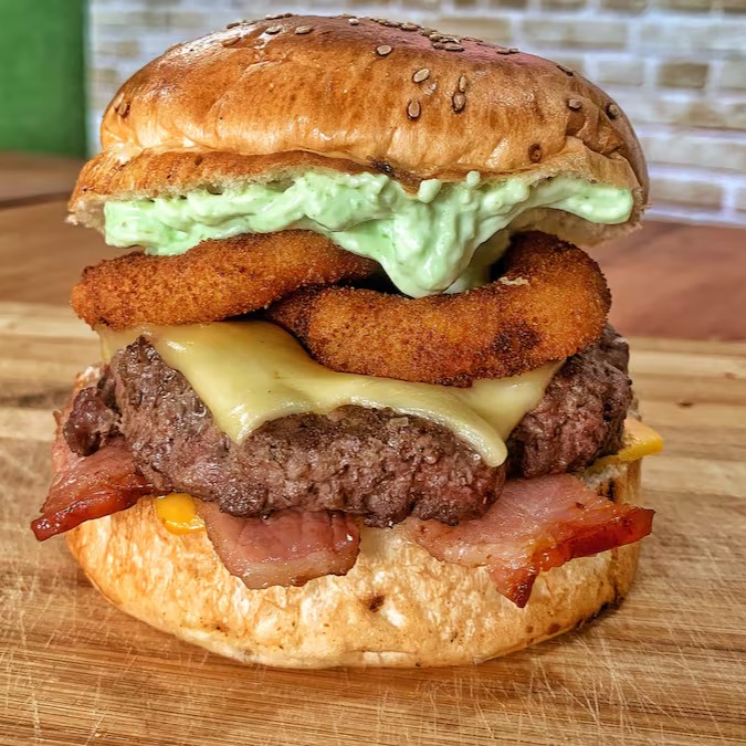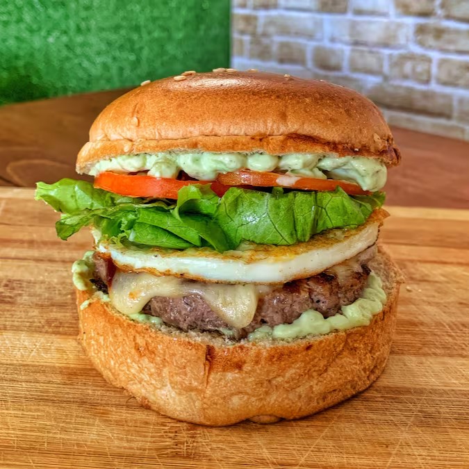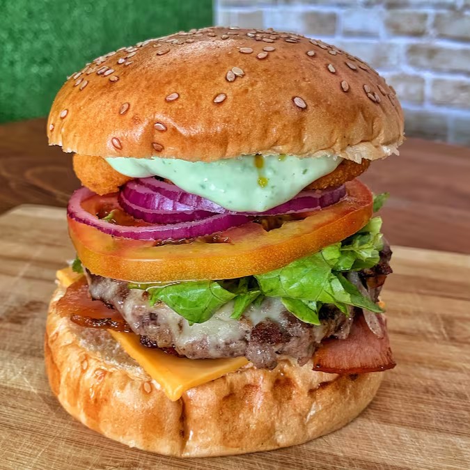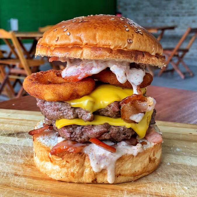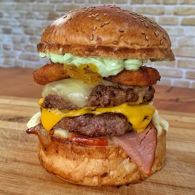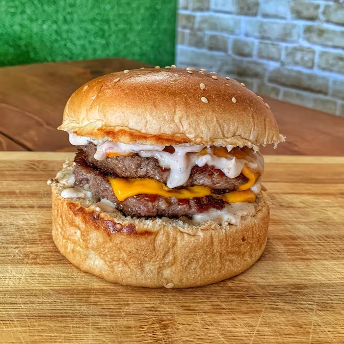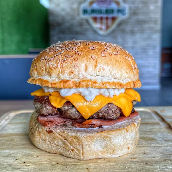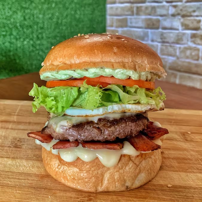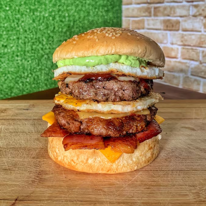 Delicioso burger artesanal recheado com 2 suculentos hambúrgueres, queijos derretidos, ovos fritos, bacon crocante e um mix de molhos barbecue e maionese temperada. Uma explosão de sabores em cada mordida!