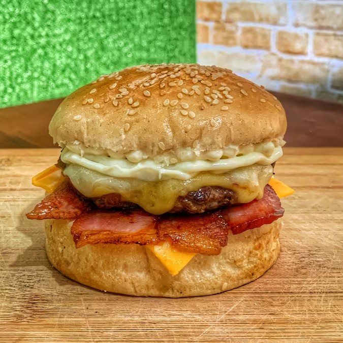 Experimente o delicioso e suculento hambúrguer artesanal com cheddar, queijo prato, bacon crocante, anéis de cebola dourados, molho barbecue e maionese temperada, tudo entre dois pães macios. Uma explosão de sabores em cada mordida!