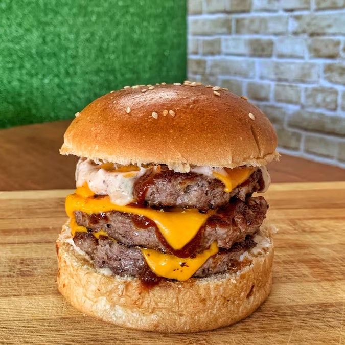 Delicioso e suculento, o Hambúrguer Triplo é a combinação perfeita de 3 suculentos hambúrgueres artesanais, queijo cheddar derretido, bacon crocante, molho barbecue e maionese grill, tudo isso envolto em um pão macio e fresquinho. Uma explosão de sabor em cada mordida!