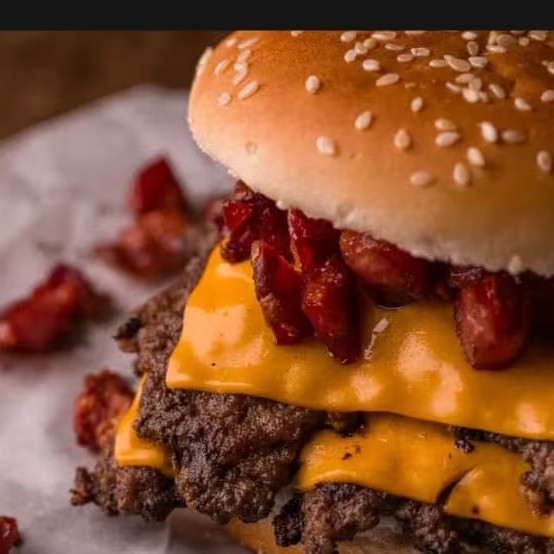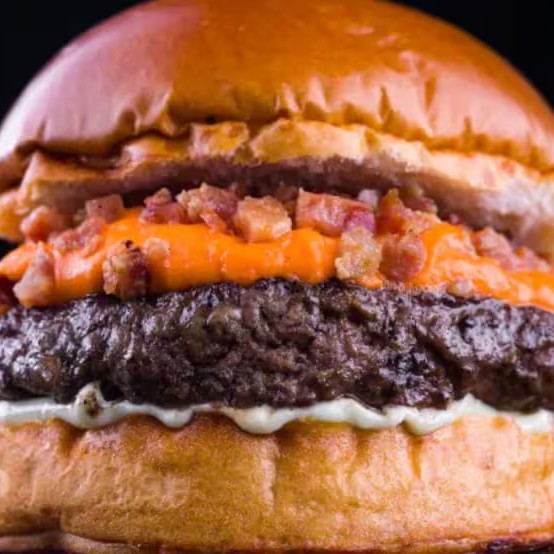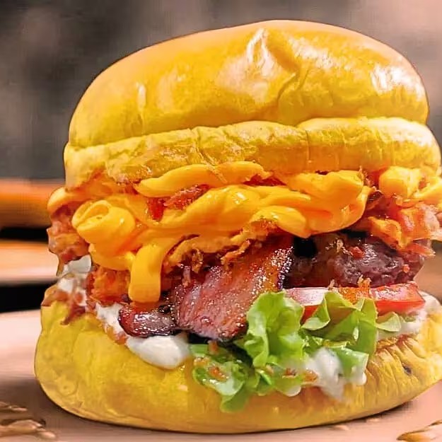 Pão brioche, maionese baconese artesanal, burger de carne, chedar cremoso e bacon e cubos.