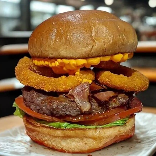 Pão brioche, burger de carne, maionese artesanal de bacon, mozarela, três onion rings e molho barbecue.