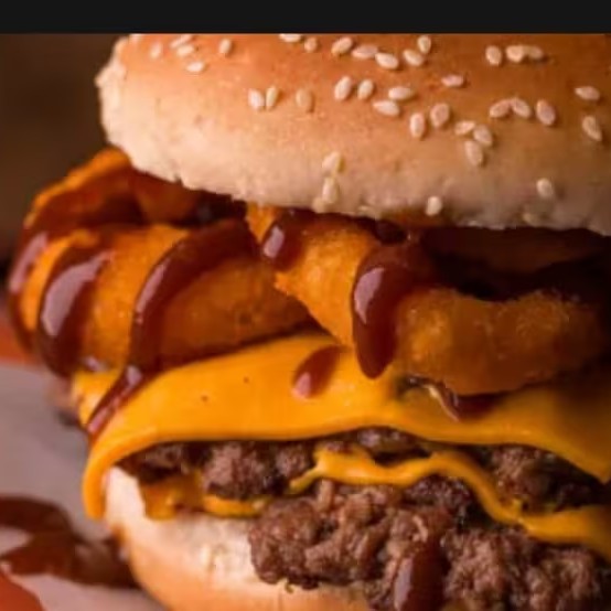 Pão de brioche, dois smash burgers de 60g cada, duas fatias de queijo cheddar, onion rings e molho barbecue.
