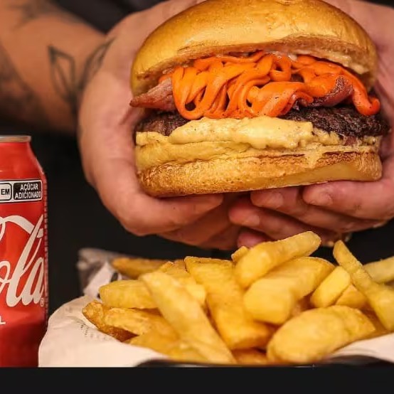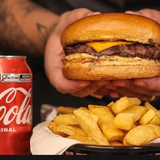 Pão de brioche selado, maionese artesanal sabor bacon, blend bovino 100%, fatias de bacon genorosas, cheddar cremoso + batata frita + coca cola gelada(escolha a sua na descrição, zero ou Original)