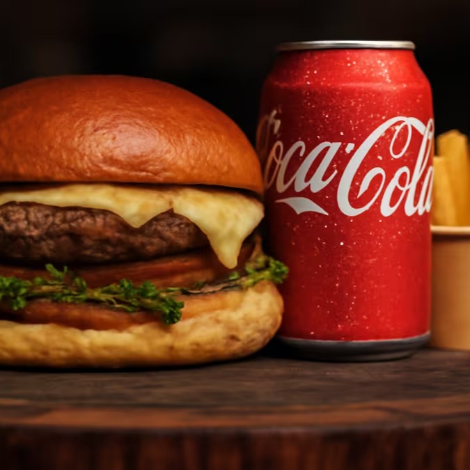 Pão brioche, dois smash burgers de 60g cada, queijo cheddar, bacon em cubos e molho barbecue + Coca-Cola 350ml