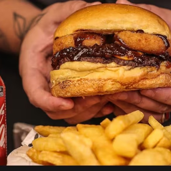 Pão de brioche selado, maionese caseira sabor bacon, blend bovino 100g ao ponto perfeito, 3 onion rings crocantes, finalizado com molho barbecue. Textura crocante e sabor defumado + batata frita individual + coca cola gelada (escolha a sua na descrição, zero ou Original)