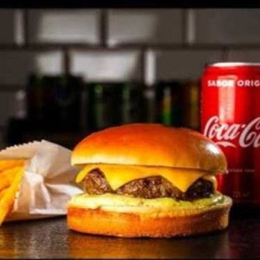 Pão de brioche selado, maionese artesanal, hambúrguer 100% bovino 100g, queijo mussarela, alface crocante e tomate fresco + porção individual de batata frita + Coca Cola na faixa
