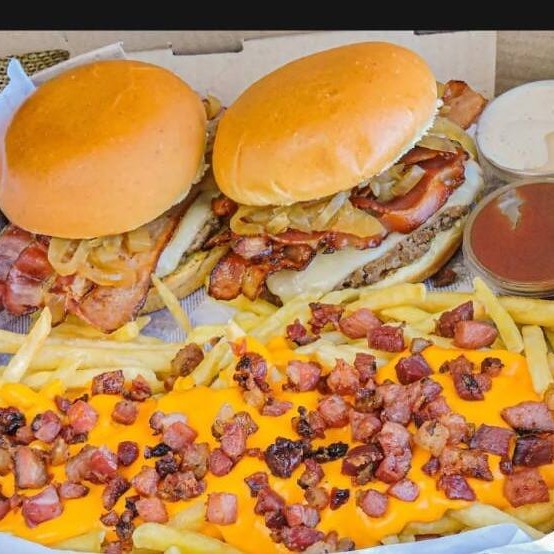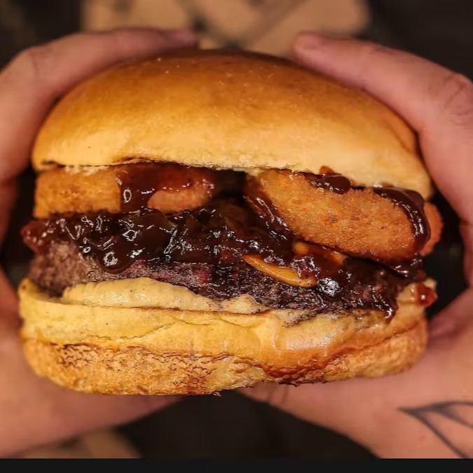 Pão brioche, dois smash burgers de 60g cada, queijo cheddar, bacon em cubos e molho barbecue.