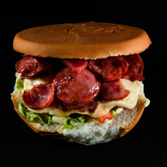 Pão Brioche Artesanal, Hambúrguer 120g, Calabresa em Rodelas na chapa, Queijo Mussarela, Salada de Alface e Tomate tomate.