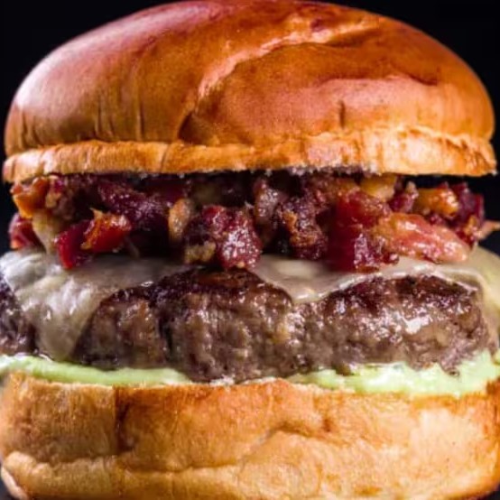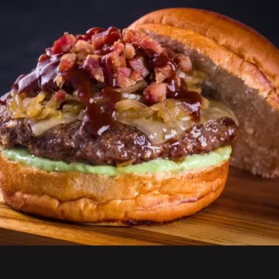 Pão brioche, burger de carne, maionese caseira artesanal, mozarela derretida, cebola grelhada, bacon em cubos e molho barbecue.