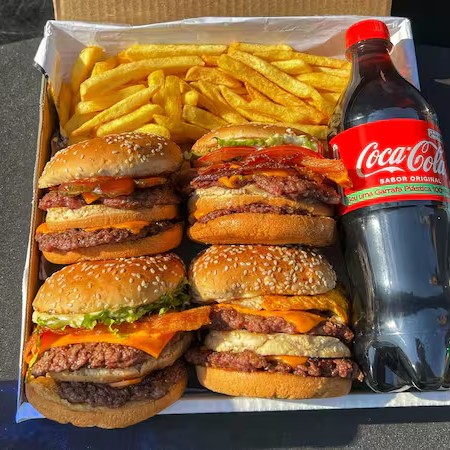 Combo especial com 4 burgers deliciosos feitos na hora. Escolha o lanche que preferir! Acompanhado de porção de batata frita, molhos especiais e Coca Cola 600ml geladíssima! Lanche Ideal para 04 pessoas.