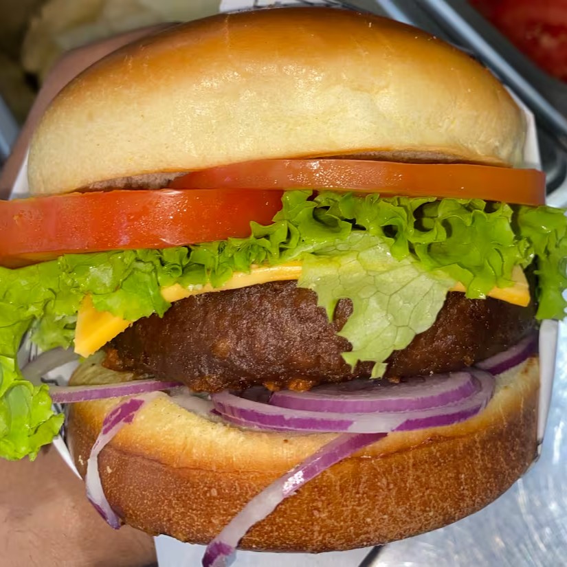 Hamburguer vegetariano 🌱 ❤️sabor carne da INCRÍVEL , pão de brioche ,cebola roxa ,cheddar e salada