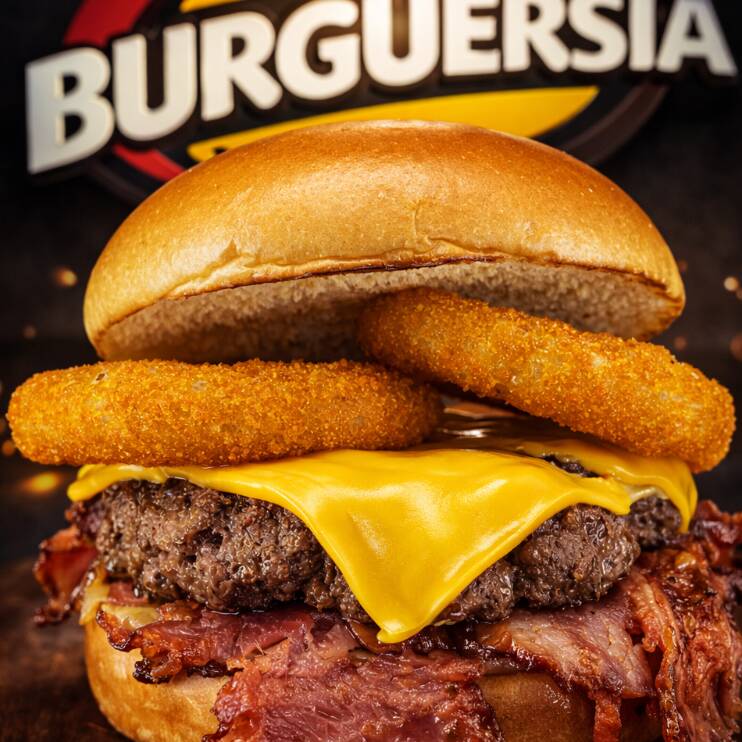 Gourmet e muita gualidade em um delicioso Pão de brioche ,bland de 140g de carne 100% bovina ,cebola caramelizada, anéis de cebola empanado bacon crocante ,cheddar fatiado ,molho barbecue e salada. (🥇🛵entrega rapida feita pela 99food)