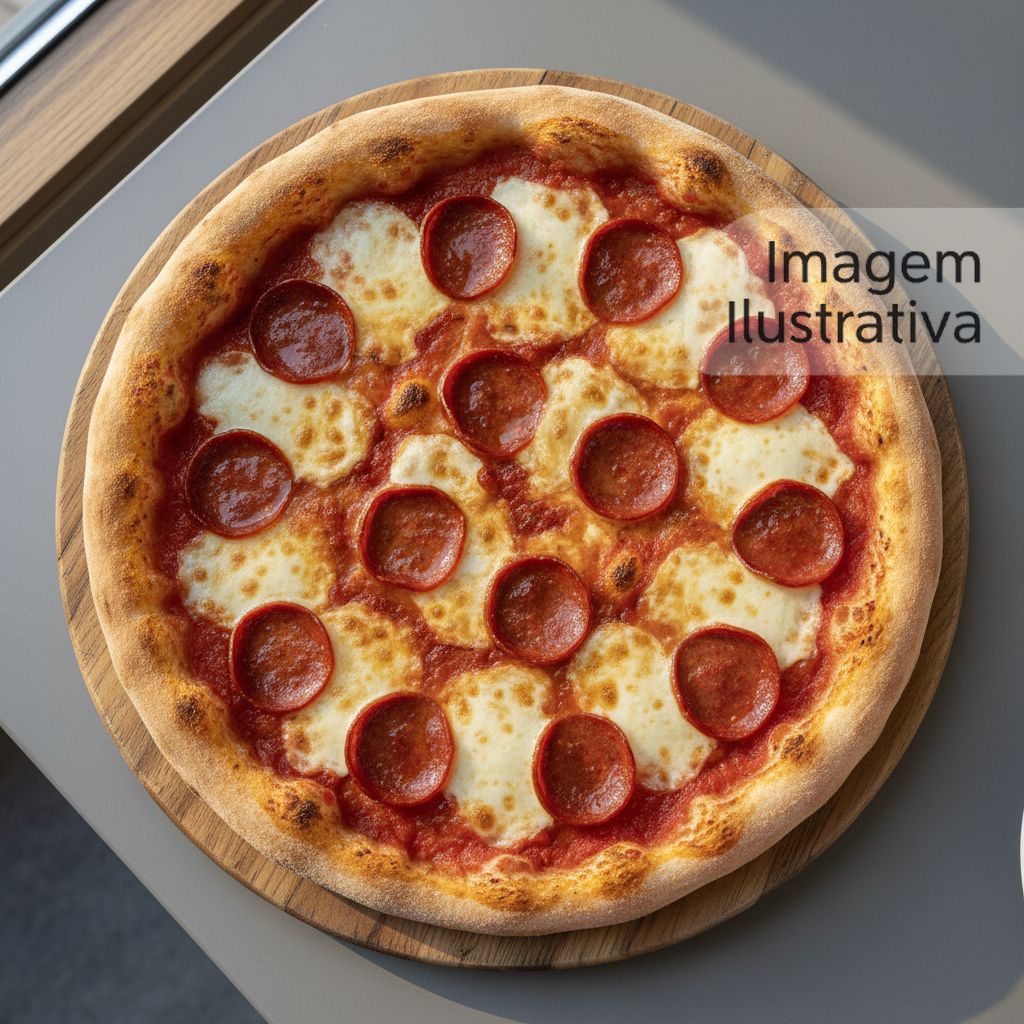 Deliciosa pizza de pepperoni com molho de pelati e queijo mussarela, pepperoni e parmesão.