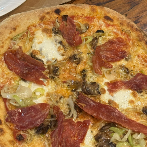 Muçarela de búfala, rúcula, presunto de parma, finalizada com queijo padano.