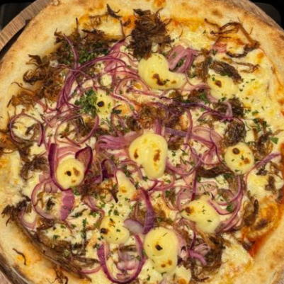 Muçarela, molho pelati, carne seca, cebola roxa, catupiry finalizada com salsinha