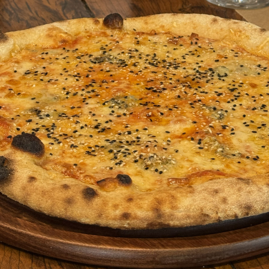 Muçarela, gorgonzola, brie e parmesão, finalizada com mel trufado.