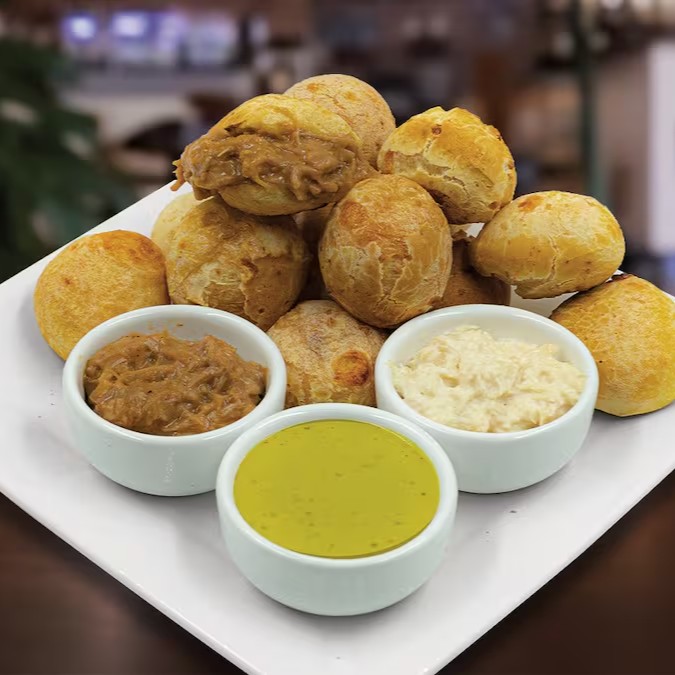 Nosso delicioso combo com 12 bão de queijo coquetel com 2 proteína a sua escolha e um molho especial.