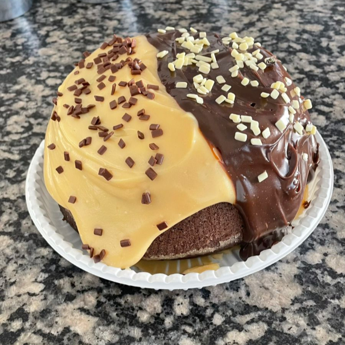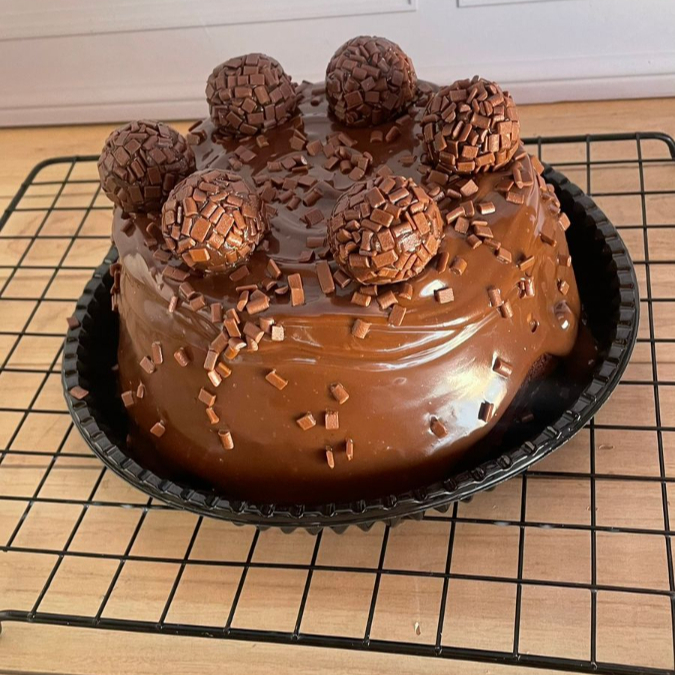 Deliciosa massa fofa de cenoura, cheio e coberto com cremoso de chocolate meio amargo e finalizado com brigadeiros.