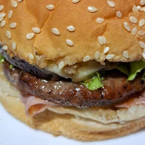 Pão de hambúrguer, uma carne de hambúrguer, um ovo, uma fatia de presunto, uma fatia de muçarela, alface e cheddar.