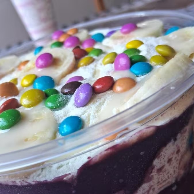 Açaí, leite condensado, leite em pó, creme de Ninho e chocoball