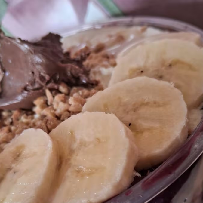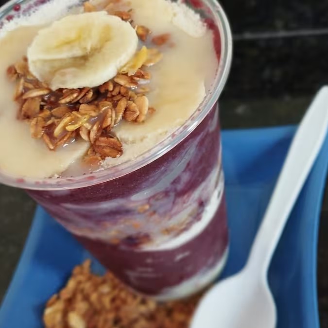 Açaí, leite, granola, leite em pó, banana e leite condensado
