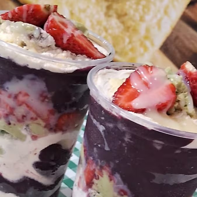 Creme de açaí, leite condensado, leite em pó, creme de pistache e morangos.