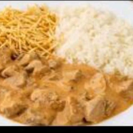 Strogonoff de frango ,champignom,azeitona,milho +batata palha.