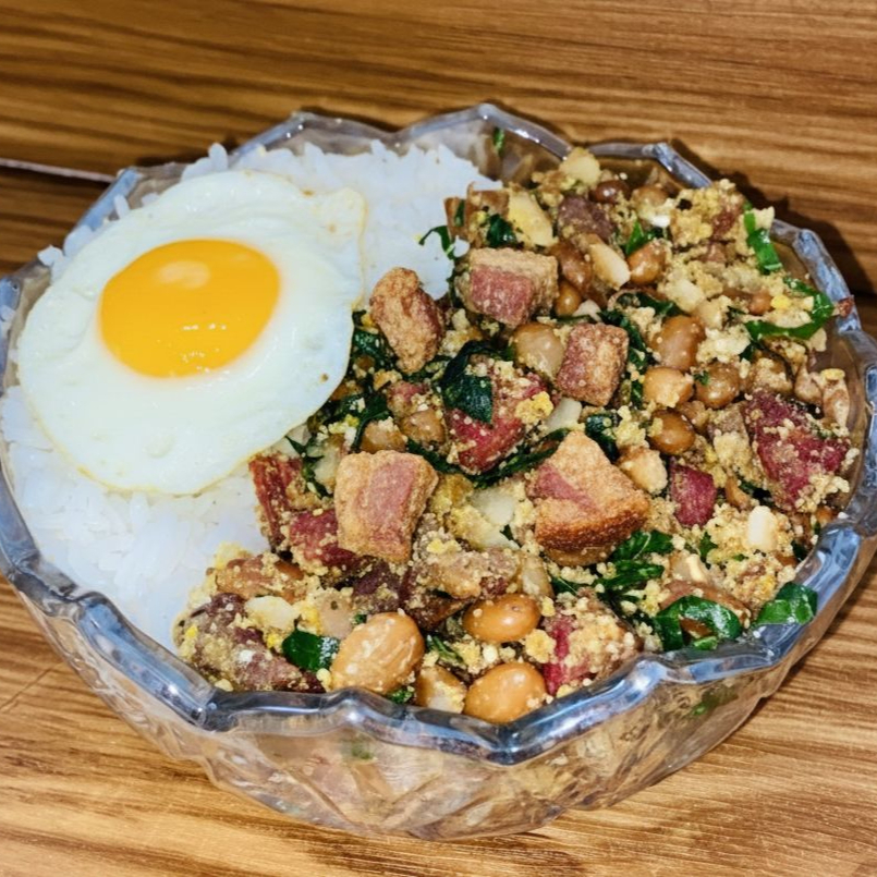 Feijão tropeiro,couve,ovo, torresmo,bacon, calabresa e pernil picadinho+arroz 500gr