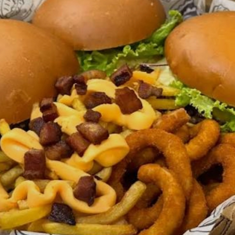 2x tudo // pão, hambúrguer de boi,ovo,mussarelas, presunto, bacon, tomate,alface, milho,batata palha, //Nuguets, batata frita com/ cheddar é bacon, calabresa acebolada.