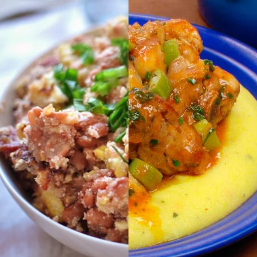 Dois marmitex grandes: 1 com tropeiro, arroz, ovo frito e linguiça + 1 com frango com quiabo, arroz, feijão comum, angu e salada a parte.