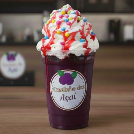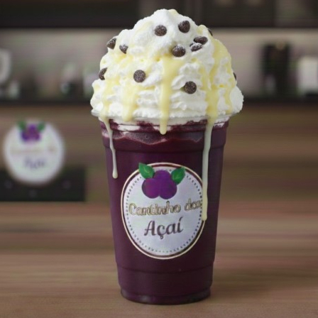 O delicioso creme de Açaí do Cantinho, acompanhado de Gotas de Chocolate ao Leite, Chantilly, Leite em pó e Leite condensado. Os itens que compõe o açaí são enviados no pote juntamente com o creme de açaí. Os acréscimos pagos são enviados em potes separados.