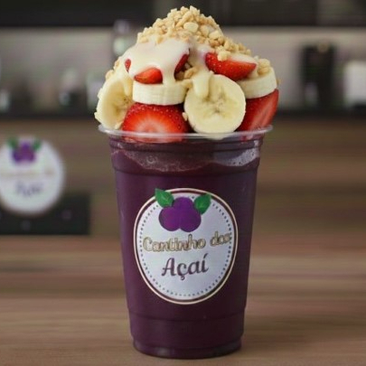 O delicioso creme de Açaí do Cantinho, acompanhado de Morango, Banana, Cobertura de Leite Condensado e Castanha. Os itens que compõe o açaí são enviados no pote juntamente com o creme de açaí. Os acréscimos pagos são enviados em potes separados.