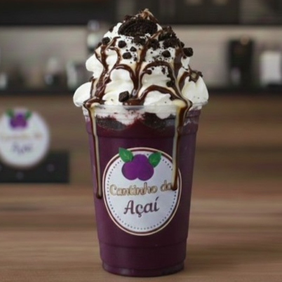 O delicioso creme de Açaí do Cantinho, acompanhado de Leite Condensado, Chantilly, Cobertura de Chocolate e Biscoito Oreo em Gotas. Os itens que compõe o açaí são enviados no pote juntamente com o creme de açaí. Os acréscimos pagos são enviados em potes separados.