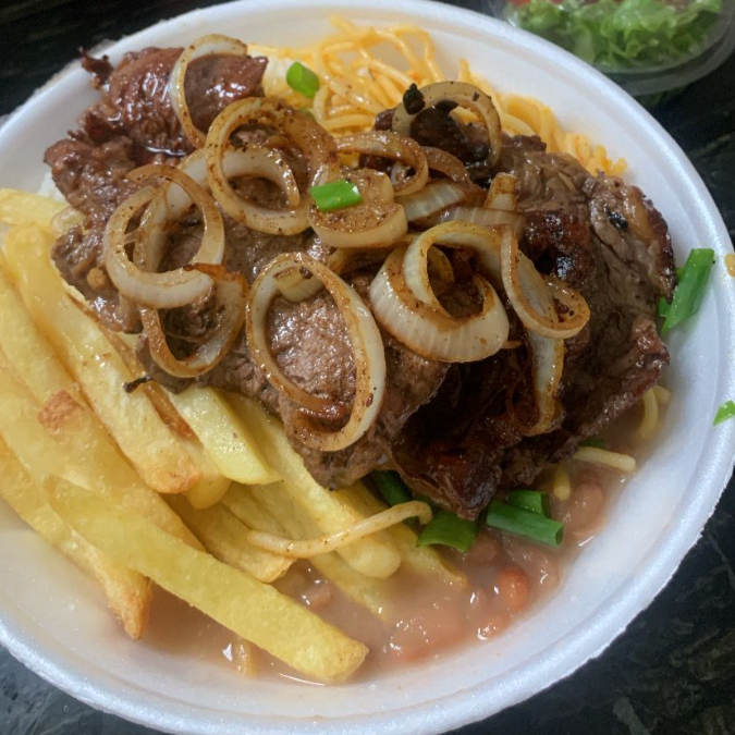 Acompanha delicoso arroz branco, feijão, macarrão, farofinha caseira , batata frita e salada 🥗.