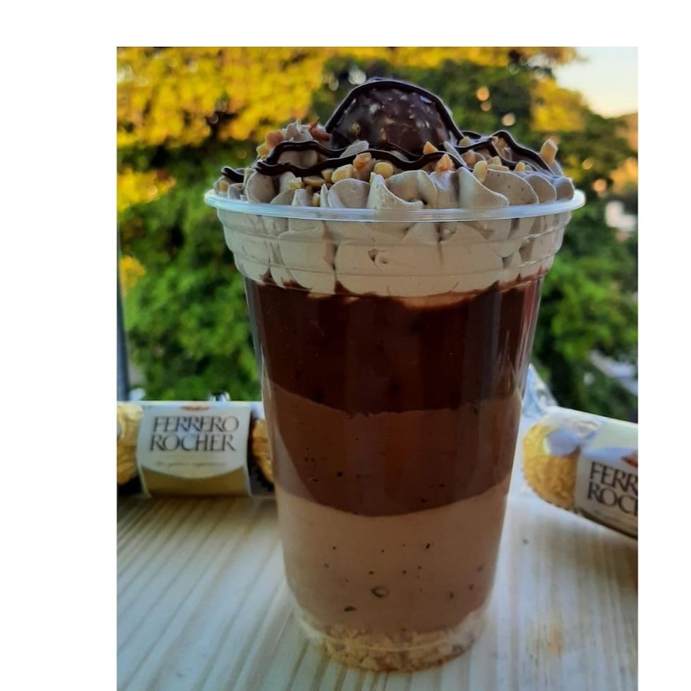 Delicioso copo com crocante de amendoim, mousse de chocolate, brigadeiro, brownie, ganche de Nutella, finalizado com chantilly e bombom ferrero rocher.