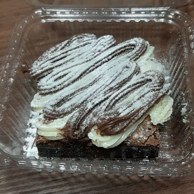 Delicioso creme branco, creme de Nutella, Kinder bueno, brownie e raspas de chocolate branco.