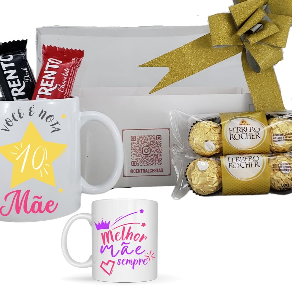 Box caneca Você é nota 10 Mãe. Qtd: Item 1 - Caneca - 320ml 2 - Trento - 32g 2 - Ferrero T3 - 37,5g 1 - Cartão de Mensagem 1 - Caixa Box (22x15,5x9cm) 1 - Laço Total de 8 itens.