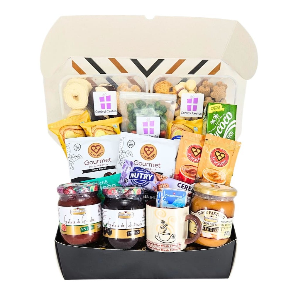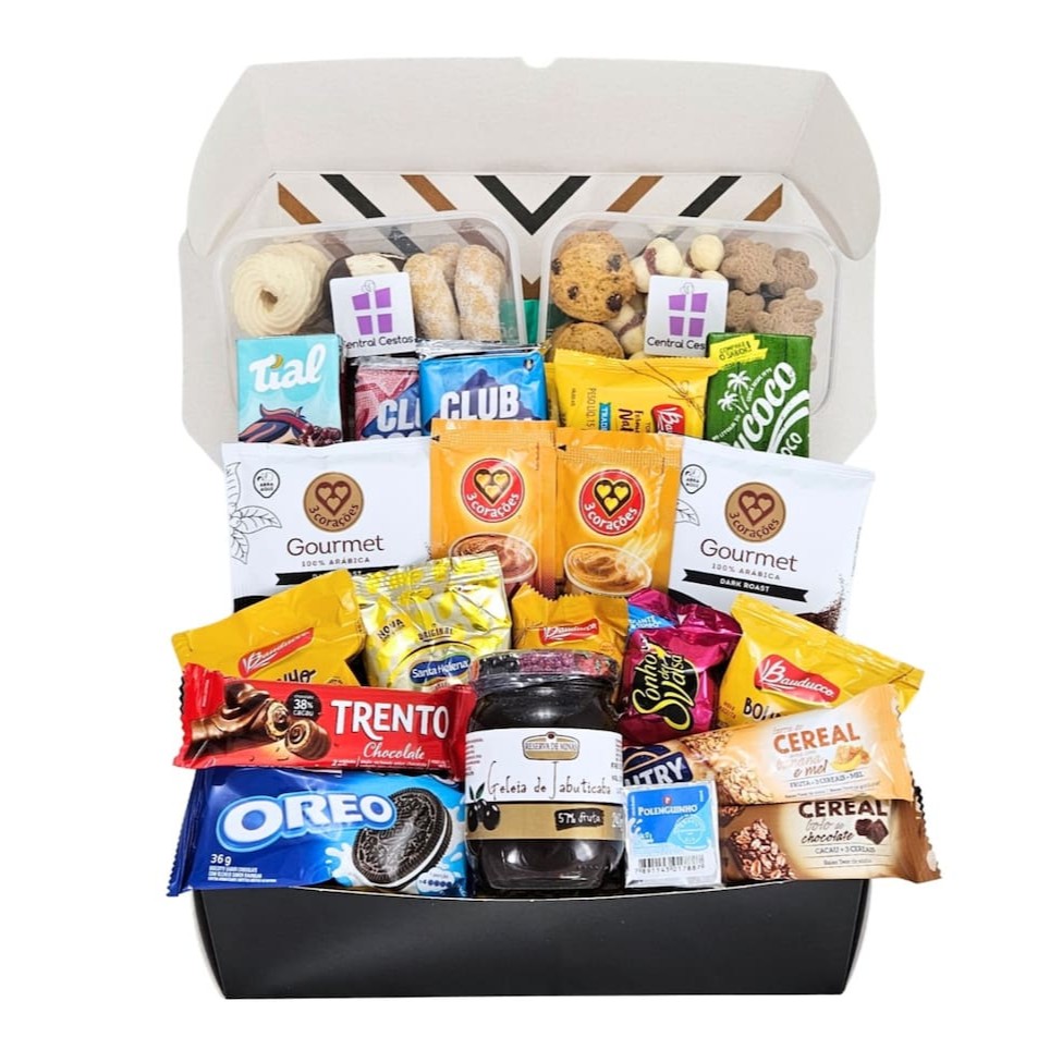 Coffee Box (Manhã / Tarde): Conteúdo: Qtd Item 1 Água De Coco 200ml 1 Suco 200ml 1 Geleia De Jabuticaba – 240g 1 Mini-Amendoin – 30g 1 Biscoito Fino Chocolate/Coco/Limão – 200g 1 Biscoito Fino Cookie/Beijinho/Canelinha – 200g 1 Bolinho De Chocolate Bauducco 40g 1 Bolinho De Baunilha Com Morango Bauducco 40g 2 Torrada Salgada Bauducco 15g 1 Biscoito Amanteigado De Leite Bauducco 11,5g 1 Biscoito Amanteigado De Chocolate Bauducco 11,5g 1 Biscoito Amanteigado De Banana E Canela Bauducco 11,5g 1 Biscoito Recheado Oreo 36g 2 Biscoito Clube Social 26g 2 Barra De Cereal Nutry 25g 2 Bombom Sonho de Valsa 20g 1 Trento 32g 1 Capuccino Chocolate – Três Corações 10g 1 Capuccino Tradicional – Três Corações 10g 4 Sache De Chá – 2g 2 Sache De Açucar 2 Sache De Adoçante 1 Manteiguinha 10g 2 Melzinho 15g 2 Queijo Polenguinho 17g 2 Café Gourmet 3 Corações – Drip Coffee 11g 1 Cartão De Msg 1 Box (Papel Cartão) (27×19,5x9cm) Total De 40 Itens Obs.: Na falta de um dos itens acima o mesmo será substituido.