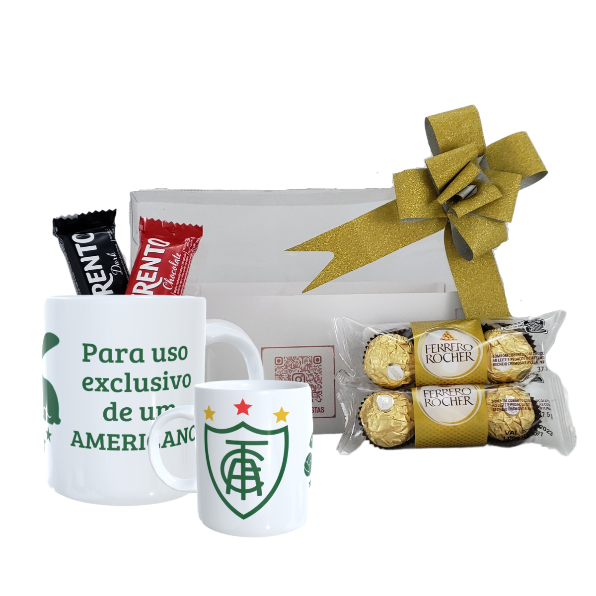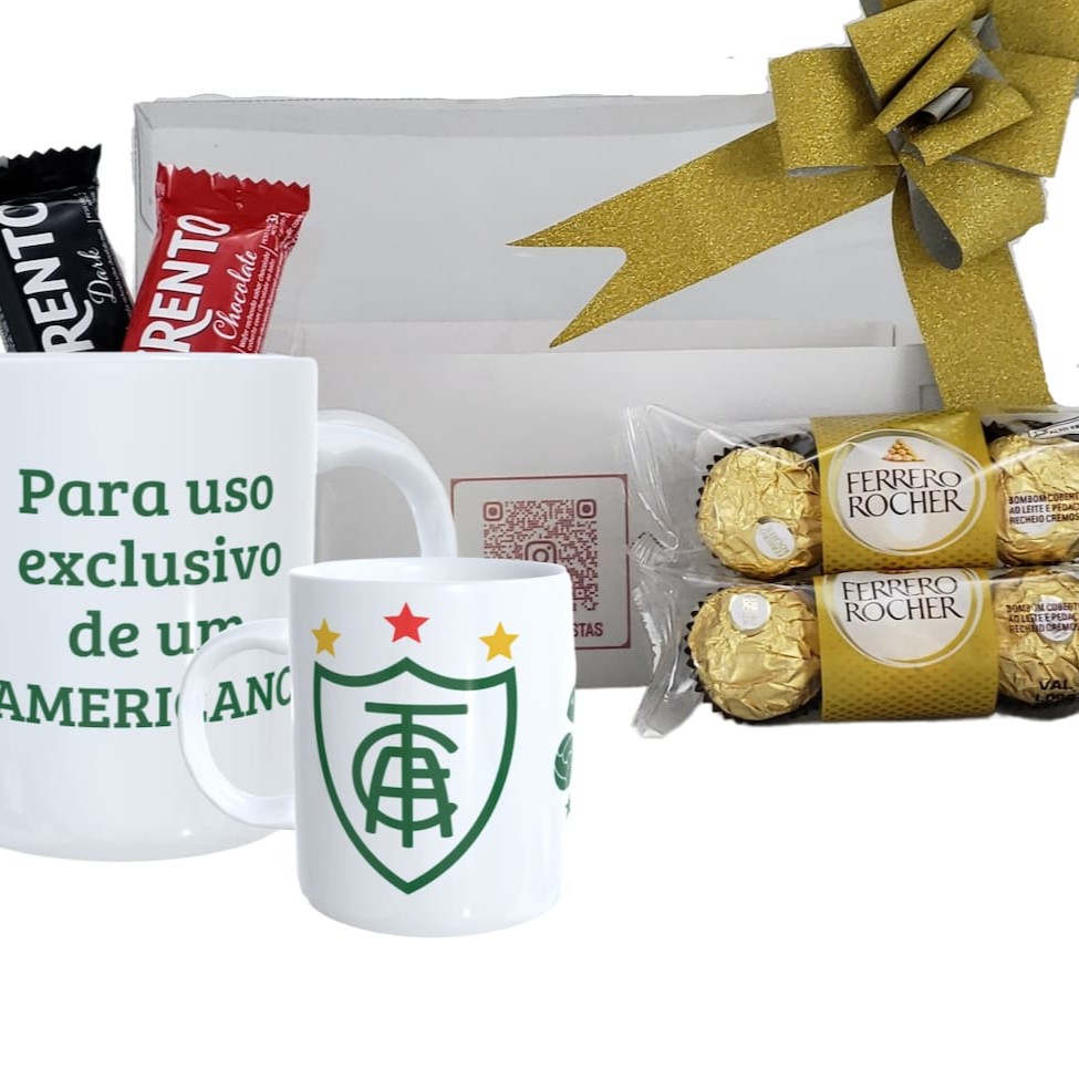 Box caneca América Qtd: Item 1 - Caneca - 320ml 2 - Trento - 32g 2 - Ferrero T3 - 37,5g 1 - Cartão de Mensagem 1 - Caixa Box (22x15,5x9cm) 1 - Laço Total de 8 itens.