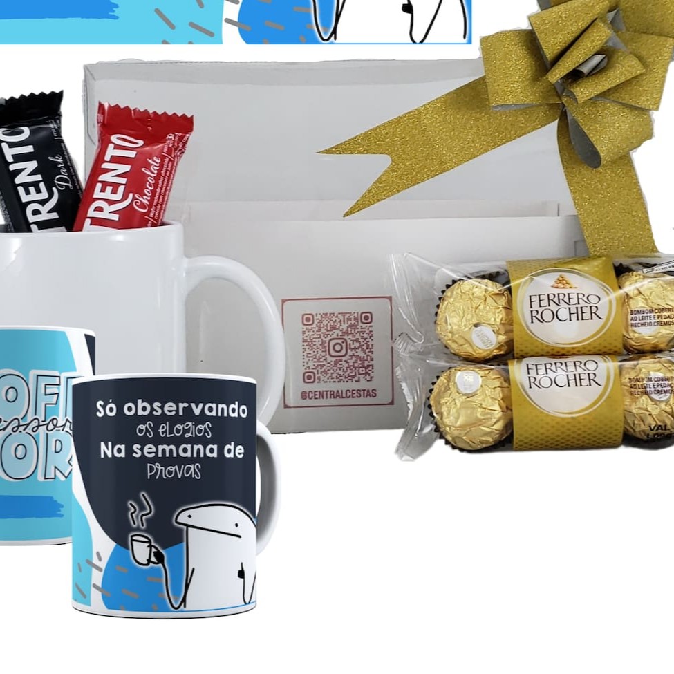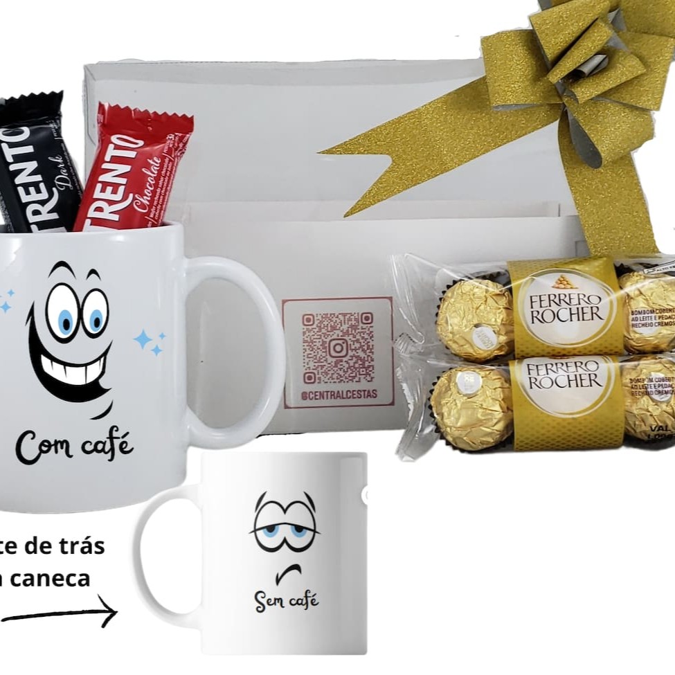 Box caneca com café Qtd: Item 1 - Caneca - 320ml 2 - Trento - 32g 2 - Ferrero T3 - 37,5g 1 - Cartão de Mensagem 1 - Caixa Box (22x15,5x9cm) 1 - Laço Total de 8 itens.