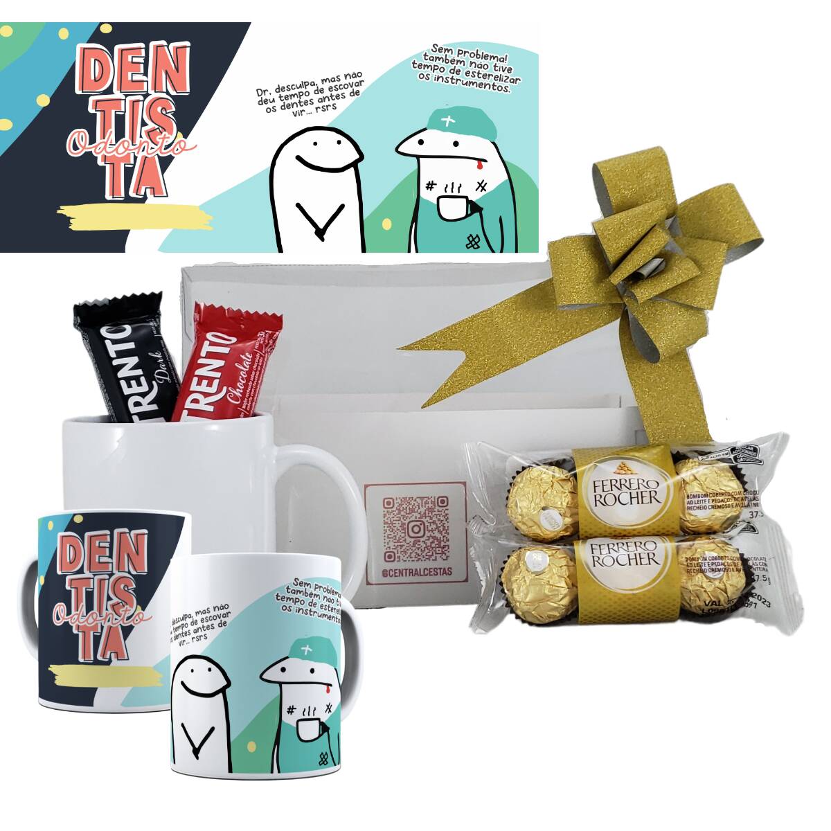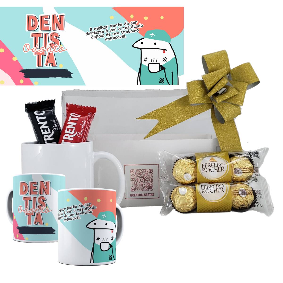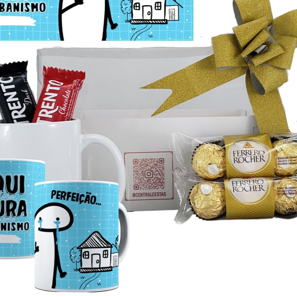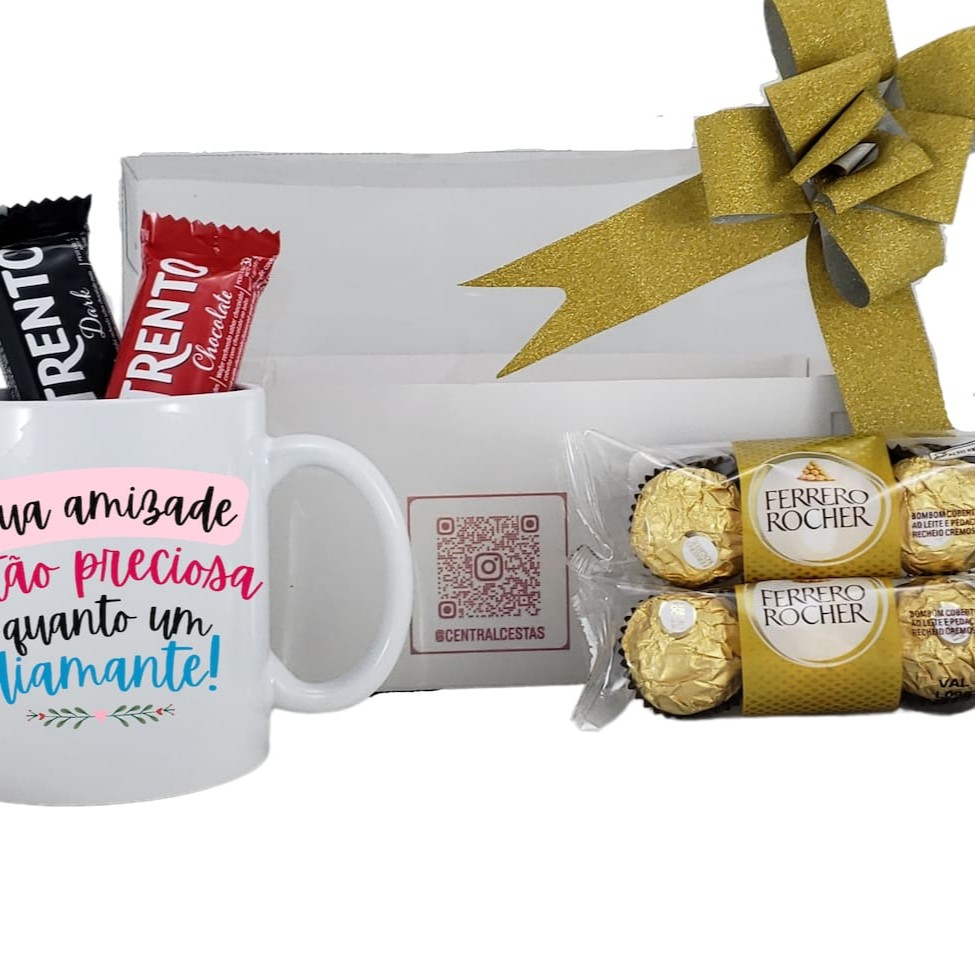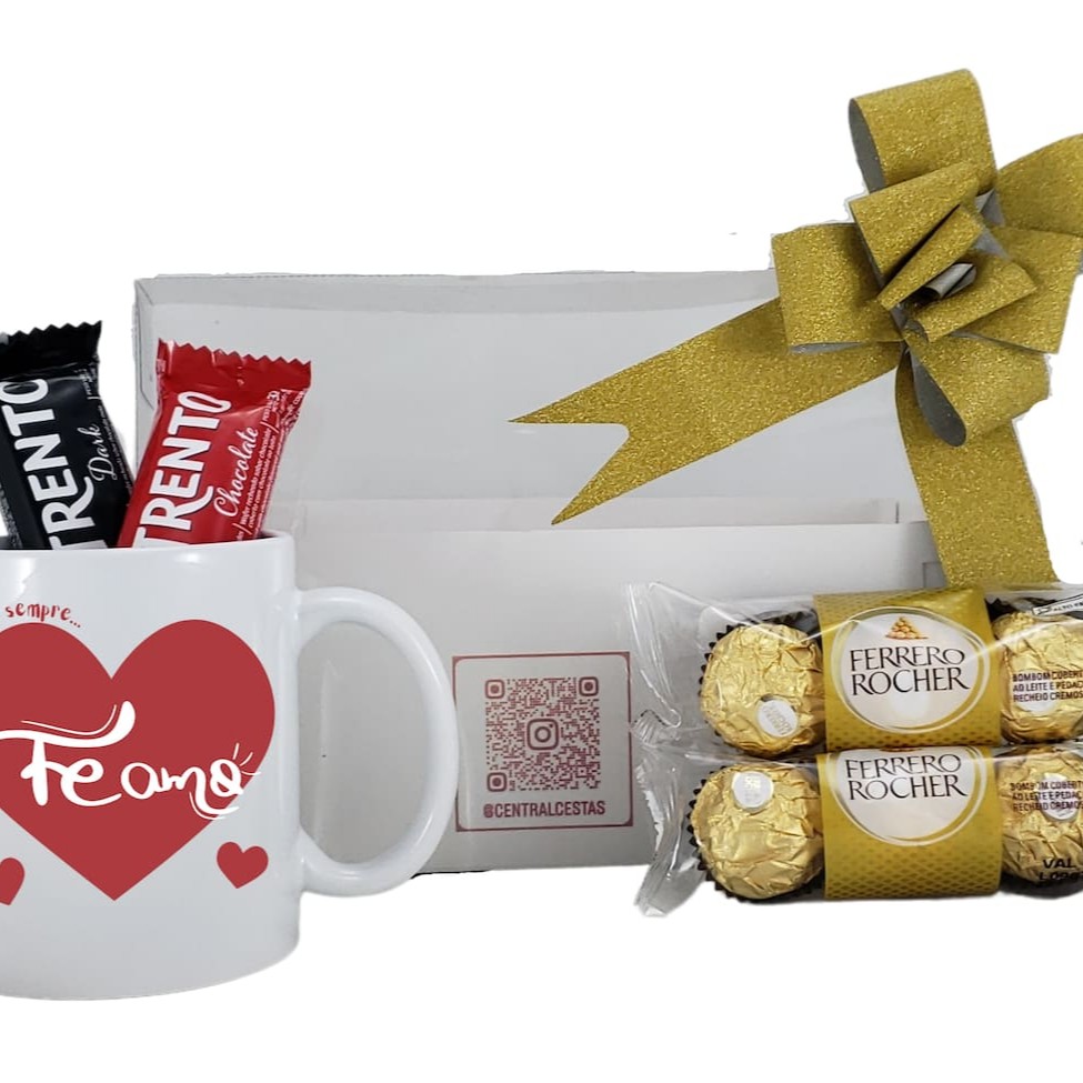 Box caneca Qtd: Item 1 - Caneca - 320ml 2 - Trento - 32g 2 - Ferrero T3 - 37,5g 1 - Cartão de Mensagem 1 - Caixa Box (22x15,5x9cm) 1 - Laço Total de 8 itens.