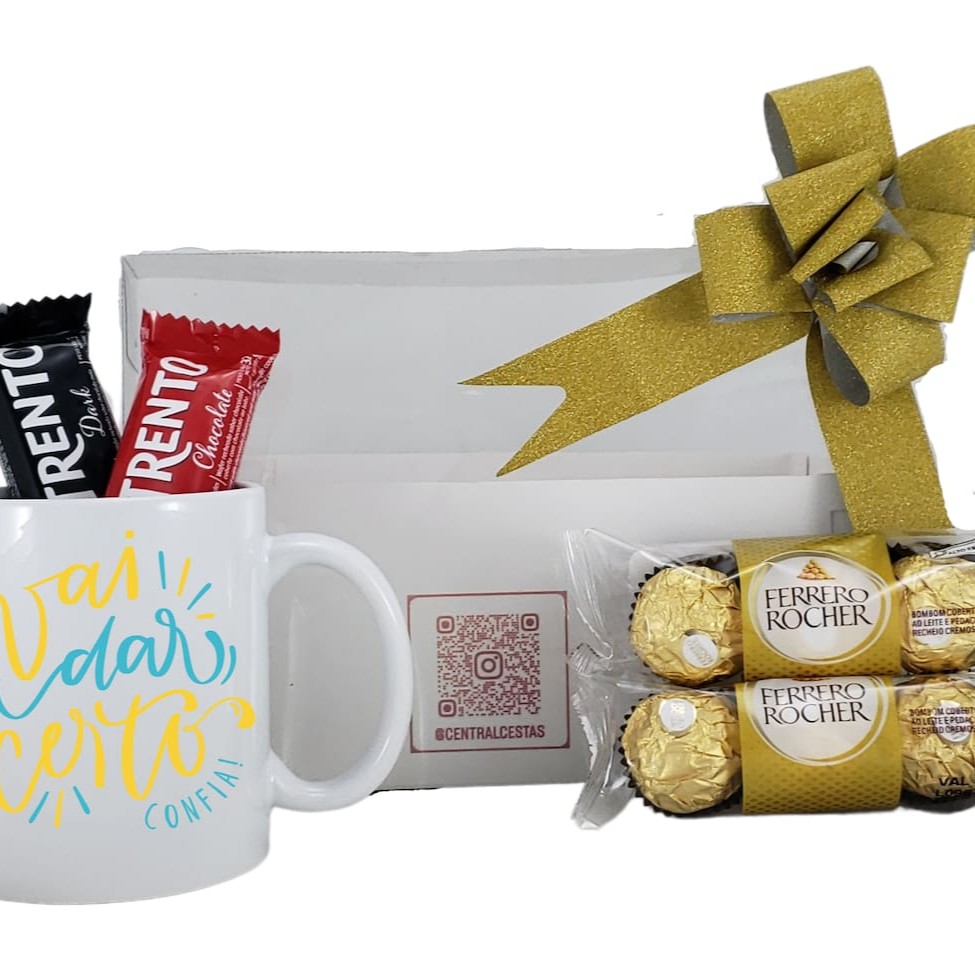 Box caneca Vai dar certo Qtd: Item 1 - Caneca - 320ml 2 - Trento - 32g 2 - Ferrero T3 - 37,5g 1 - Cartão de Mensagem 1 - Caixa Box (22x15,5x9cm) 1 - Laço Total de 8 itens.