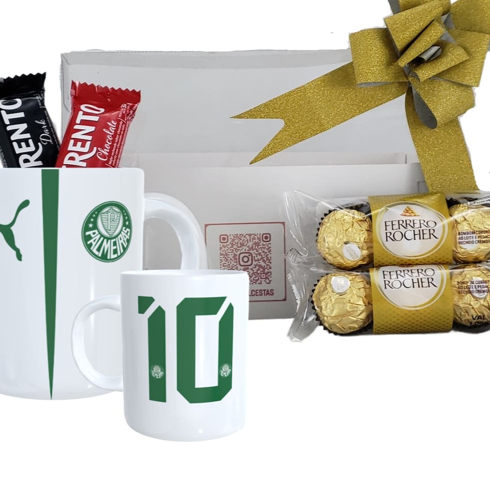 Box caneca Palmeiras Qtd: Item 1 - Caneca - 320ml 2 - Trento - 32g 2 - Ferrero T3 - 37,5g 1 - Cartão de Mensagem 1 - Caixa Box (22x15,5x9cm) 1 - Laço Total de 8 itens.