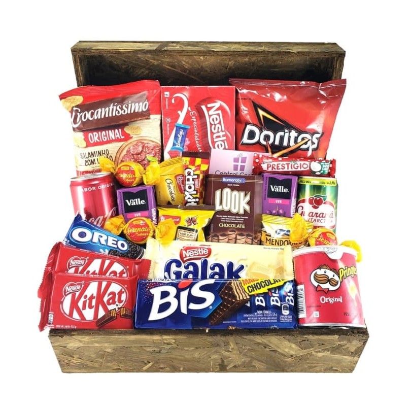Baú de Guloseimas (Manhã / Tarde) Conteúdo: 2 Suco De Uva 200ml 1 Coca-Cola – Lata 310ml 1 Guaraná Antartica – Lata 269ml 1 Batata Pringles 40g 1 Mini-Amendoin Japonês 27g 1 Doritos – Salgadinho Nacho 84g 1 Snacks – Crocantíssimo Ou Equilibri 40g 1 Bolinho De Chocolate Bauducco 40g 1 Bolinho De Baunilha Com Morango Bauducco 40g 1 Mini-Wafer Bauducco 40g 1 Biscoito Recheado Oreo 36g 1 Palito De Chocolate Look 55g 1 Caixa De Bombom Especialidades Nestlé – 300g 1 Caixa De Bis 126g 1 Chokito – Nestlé 32g 1 Prestígio – Nestlé 33g 3 Bombom Sonho de Valsa 20g 1 Barra De Chocolate Laka – Nestlé 100g 2 Kitkat – Nestle 41,5g 1 Baú De Madeira (M) (37x24x15cm) 1 Cartão De Mensagem Total De 25 Itens Obs.: Na falta de um dos itens acima o mesmo será substituído por outro de igual padrão e qualidade. ___#Cesta #Petisco #Drinks #Presente #Doce #Salgadinho #Café #Manhã