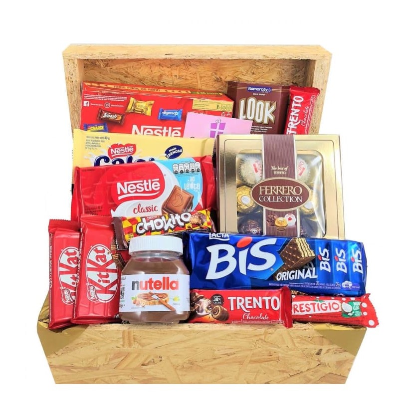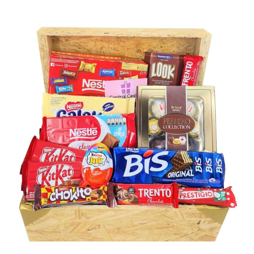 Baú de Chocolate Conteúdo: Qtd Item 1 Palito De Chocolate Look 55g 1 Creme De Avelã Nutela 140g 1 Caixa De Bombom Especialidades Nestlé – 251g 1 Caixa De Bis 126g 1 Chokito – Nestlé 32g 1 Prestígio – Nestlé 33g 2 Kitkat – Nestle 41,5g 1 Barra De Chocolate Classic – Nestlé 80g 1 Barra De Chocolate Laka – Nestlé 80g 1 Ferrero Rocher Collection T7 – 77g 2 Trento 32g 1 Baú De Madeira (P) (33x21x15cm) 1 Cartão De Mensagem Total De 15 Itens Obs.: Na falta de um dos itens acima o mesmo será substituído por outro de igual padrão e qualidade ___#Cesta #Petisco #Drinks #Presente #Doce #Salgadinho #Café #Manhã