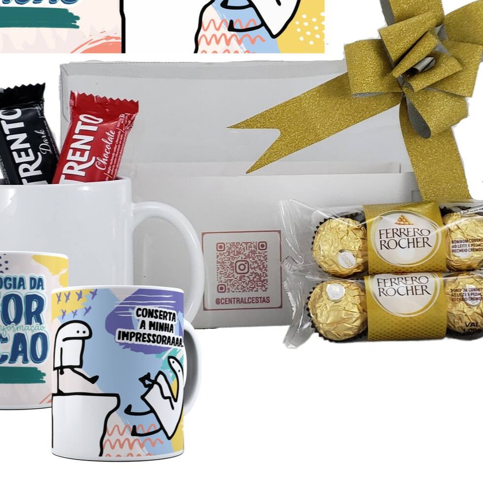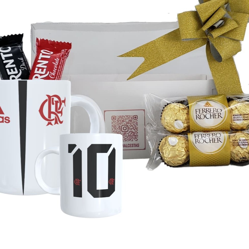 Box caneca Flamengo Qtd: Item 1 - Caneca 320ml 2 - Trento - 32g 2 - Ferrero T3 - 37,5g 1 - Cartão de Mensagem 1 - Caixa Box (22x15,5x9cm) 1 - Laço Total de 8 itens.