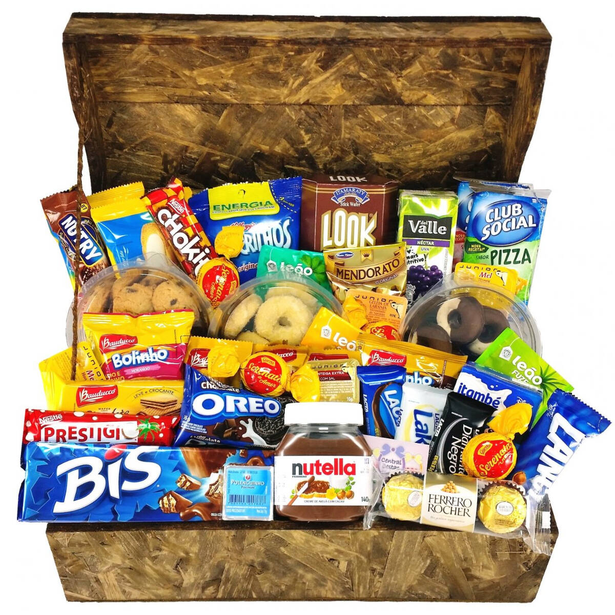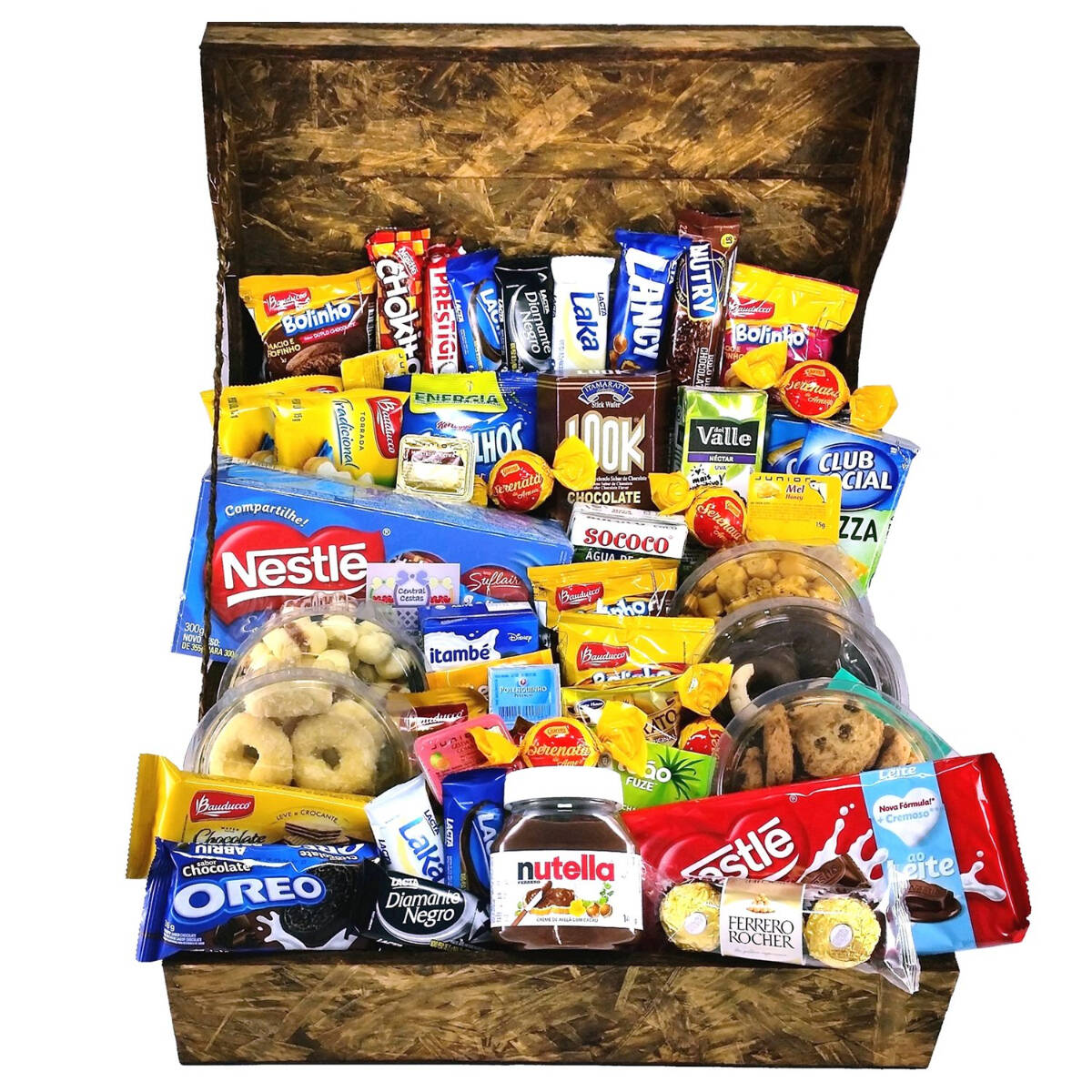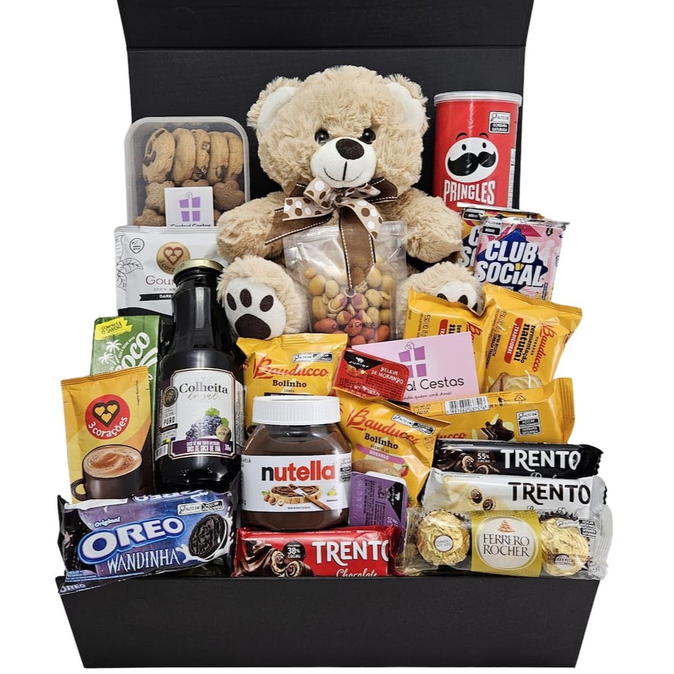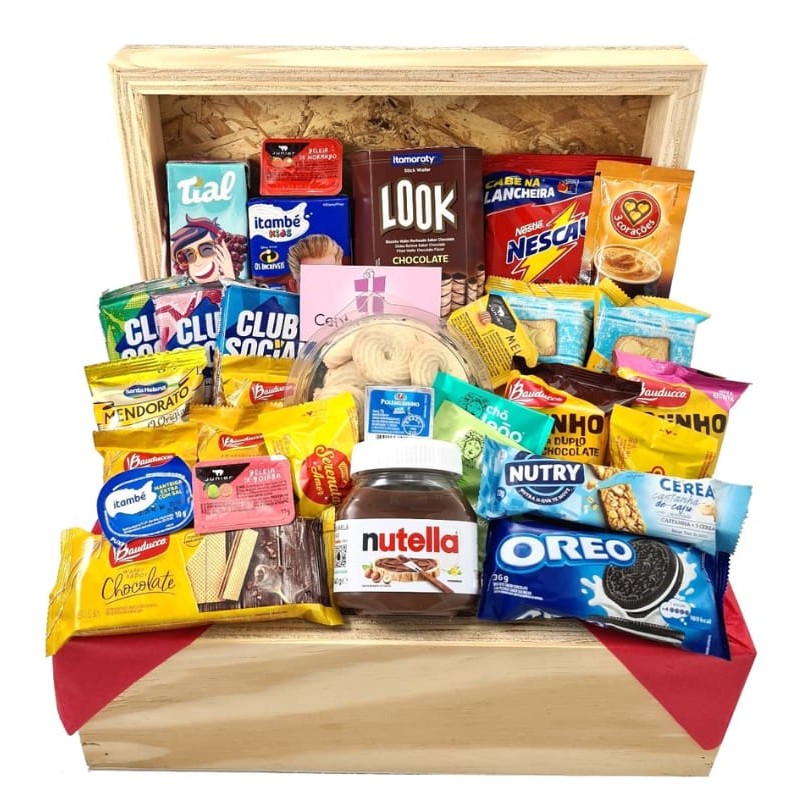 Café com Chocolate Conteúdo: 1 Achocolatado 200ml 1 Água De Coco 200ml 1 Suco De Uva 200ml 1 Mini-Amendoin Japonês 27g 1 Torradinha Caseira (60g) 1 Biscoito Fino De Chocolate (90g) 1 Biscoito Fino Casadinho (100g) 1 Biscoito Fino De Nata (100g) 1 Biscoito Fino Cookie (100g) 2 Bolinho De Chocolate Bauducco 40g 2 Bolinho De Baunilha Com Morango Bauducco 40g 3 Torrada Salgada Bauducco 15g 2 Biscoito Amanteigado De Leite Bauducco 11,5g 2 Biscoito Amanteigado De Chocolate Bauducco 11,5g 2 Biscoito Amanteigado De Banana E Canela Bauducco 11,5g 1 Mini-Wafer Bauducco 40g 1 Biscoito Recheado Oreo 36g 3 Biscoito Clube Social 26g 1 Cereal Matinal (Sucrilhos Kelloggs Ou Nestlé) 25g 1 Palito De Chocolate Look 55g 1 Barra De Cereal Nutry 25g 1 Creme De Avelã Nutela 140g 1 Caixa De Bombom Especialidades Nestlé – 251g 1 Ferrero Rocher 03 Unidades 37,5g 1 Chokito – Nestlé 32g 1 Prestígio – Nestlé 33g 5 Bombom Sonho de Valsa 20g 2 Lacta Ao Leite 20g 2 Diamante Negro 20g 2 Laka 20g 1 Lancy 30g 1 Barra De Chocolate Classic – Nestlé 80g 3 Sache De Chá – 2g 2 Sache De Açucar 2 Sache De Adoçante 3 Geleinha 15g 2 Manteiguinha 10g 2 Melzinho 15g 1 Queijo Polenguinho 17g 1 Baú De Madeira (G) (38x31x15cm) 1 Cartão De Mensagem Total De 65 Itens Obs.: Na falta de um dos itens acima o mesmo será substituído por outro de igual padrão e qualidade.