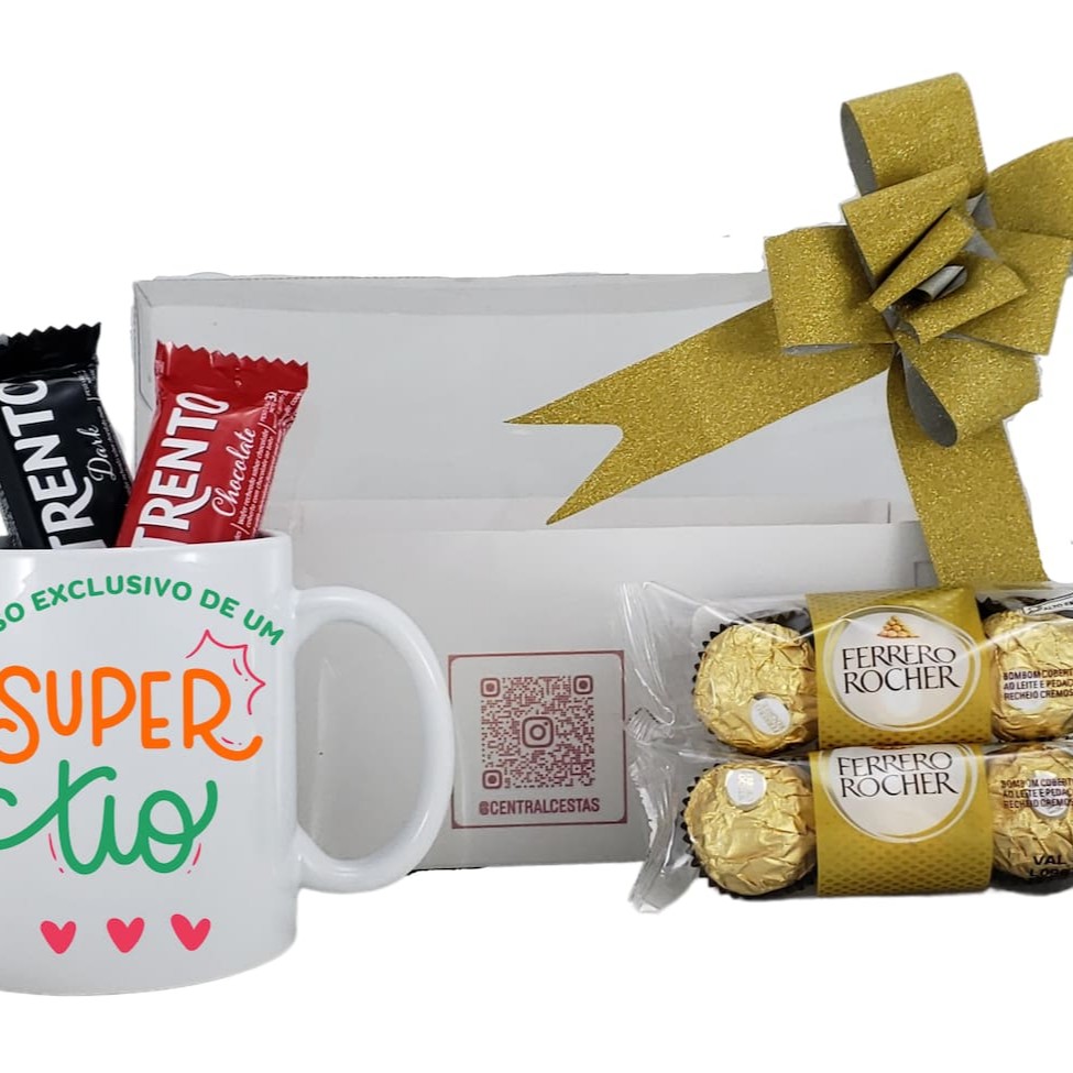 Box caneca Super Tio Qtd: Item 1 - Caneca - 320ml 2 - Trento - 32g 2 - Ferrero T3 - 37,5g 1 - Cartão de Mensagem 1 - Caixa Box (22x15,5x9cm) 1 - Laço Total de 8 itens.