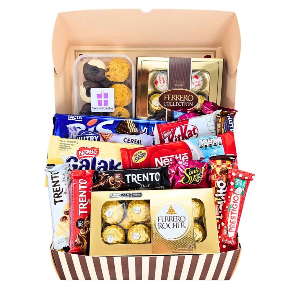 Choco Box (Manhã / Tarde) Conteúdo: Qtd Item 1 Biscoito Fino Chocolate/Cookie – 200g 2 Barra De Cereal Nutry 25g 1 Caixa De Bis 126g 1 Ferrero Rocher 08 Unidades 100g 1 Chokito – Nestlé 32g 1 Prestígio – Nestlé 33g 4 Bombom Sonho de Valsa 20g 1 Kitkat – Nestle 41,5g 1 Barra De Chocolate Classic – Nestlé 80g 1 Barra De Chocolate Laka – Nestlé 80g 1 Ferrero Rocher Collection T7 – 77g 1 Trento 32g 1 Trento Dark 32g 1 Trento Branco 32g 1 Cartão De Mensagem 1 Box (Papel Cartão) (27×19,5x9cm) Total De 20 Itens Obs.: Na falta de um dos itens acima o mesmo será substituído por outro de igual padrão e qualidade.